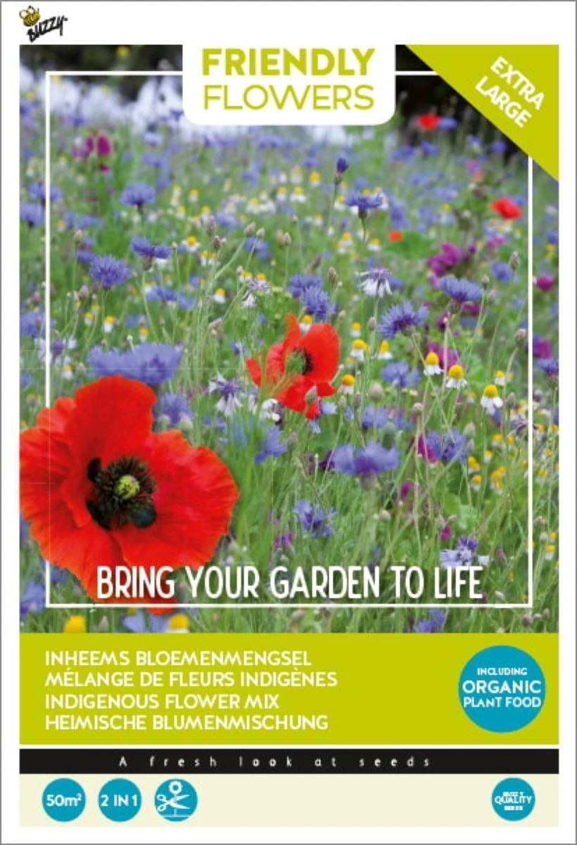 Dit mengsel bestaat uit meer dan 15 soorten eenjarige inheemse bloemen die van oorsprong voorkomen in Nederland. Deze bloemen zijn ook zeer aantrekkelijk voor bijen en vlinders en is uitermate geschikt voor een maandenlange bloemenweelde in uw tuin. De bodemverbeteraar bevat veel voedingsstoffen en verbetert de bodemstructuur en vruchtbaarheid, zo krijgen de bloemen alles wat ze nodig hebben om sterk en gezond te worden.
