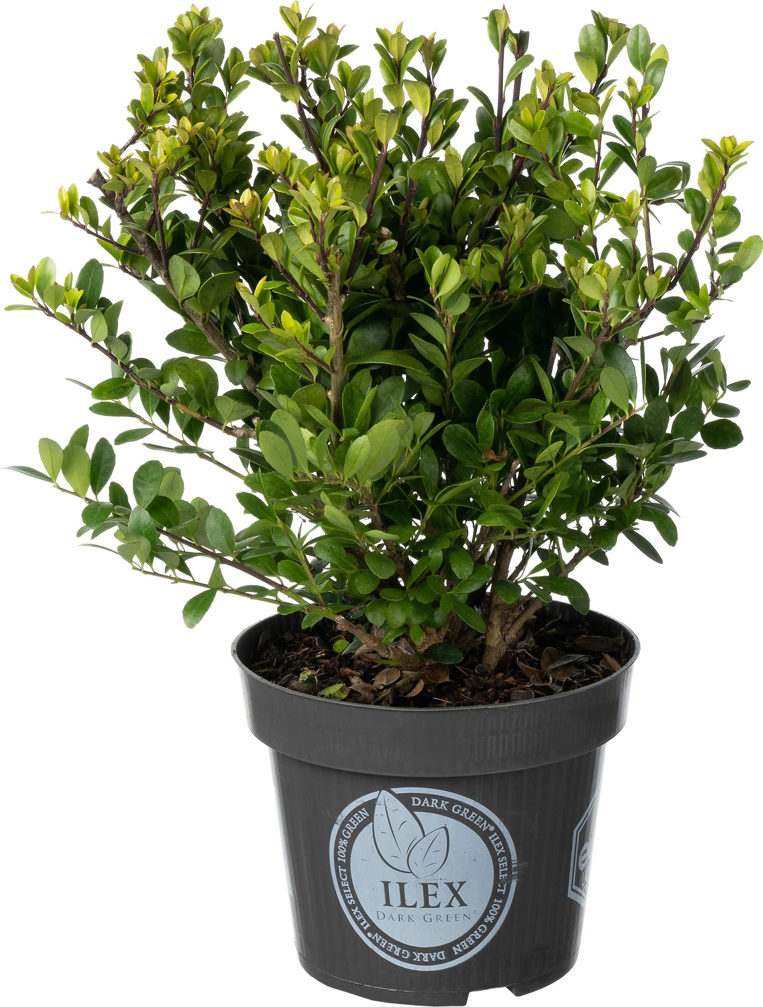 De bladeren van deze wintergroene struik hebben ongeveer dezelfde vorm en grootte als die van de Buxus. Deze Hulst krijgt onopvallende bloemen in mei en daarna zwarte bessen die giftig zijn. De hoogte wordt maximaal 80 cm en kan door vormsnoei worden beperkt.