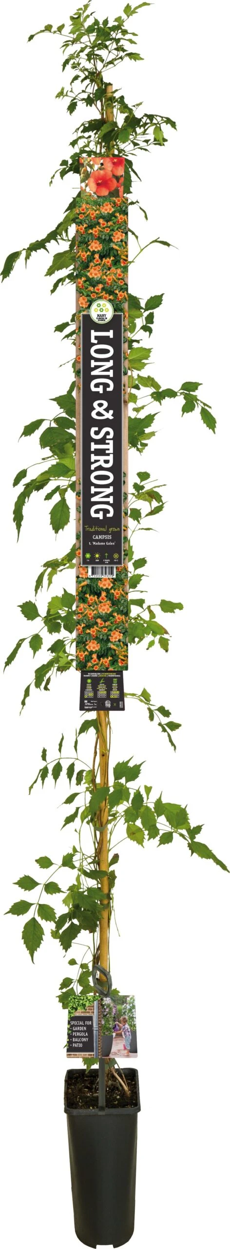 De Campsis is een flink klimmende plant die hoogtes kan halen van 10 meter. Hij bloeit als de zomer op het hoogtepunt is en bloeit ook het beste als hij flink kan genieten van de warmte. De naam dankt hij aan zijn bloemen, lange trompetvormige bloemen. De winter kan hij prima overleven. Snoei hem jaarlijks om hem goed in model te houden.